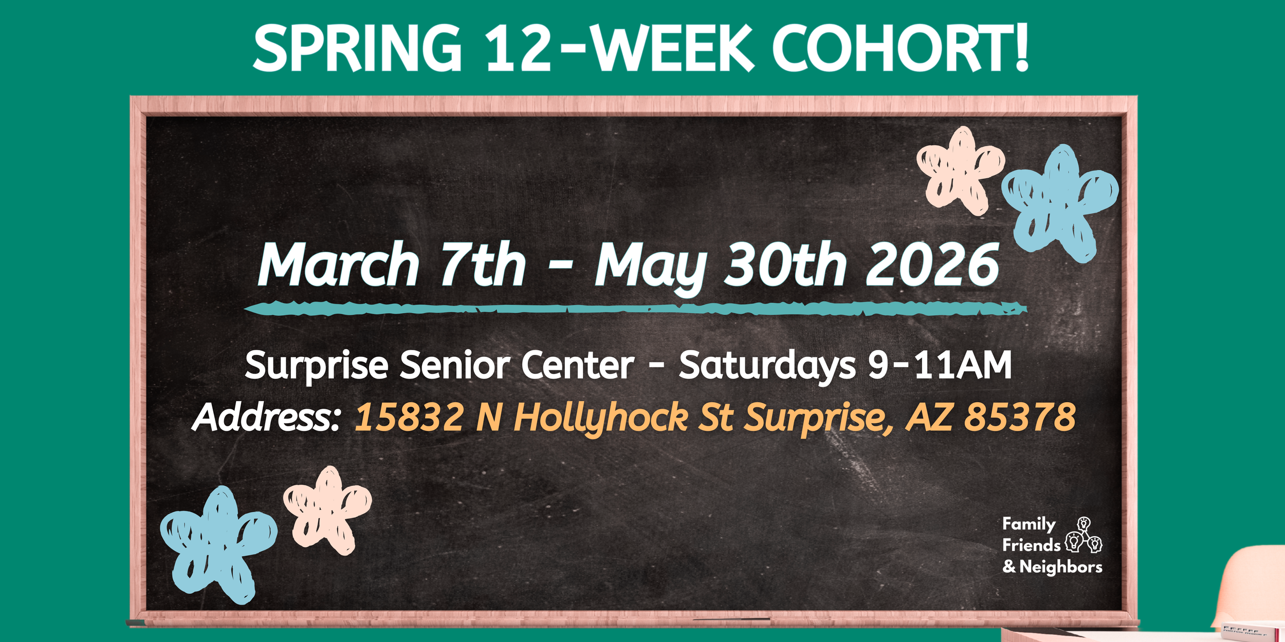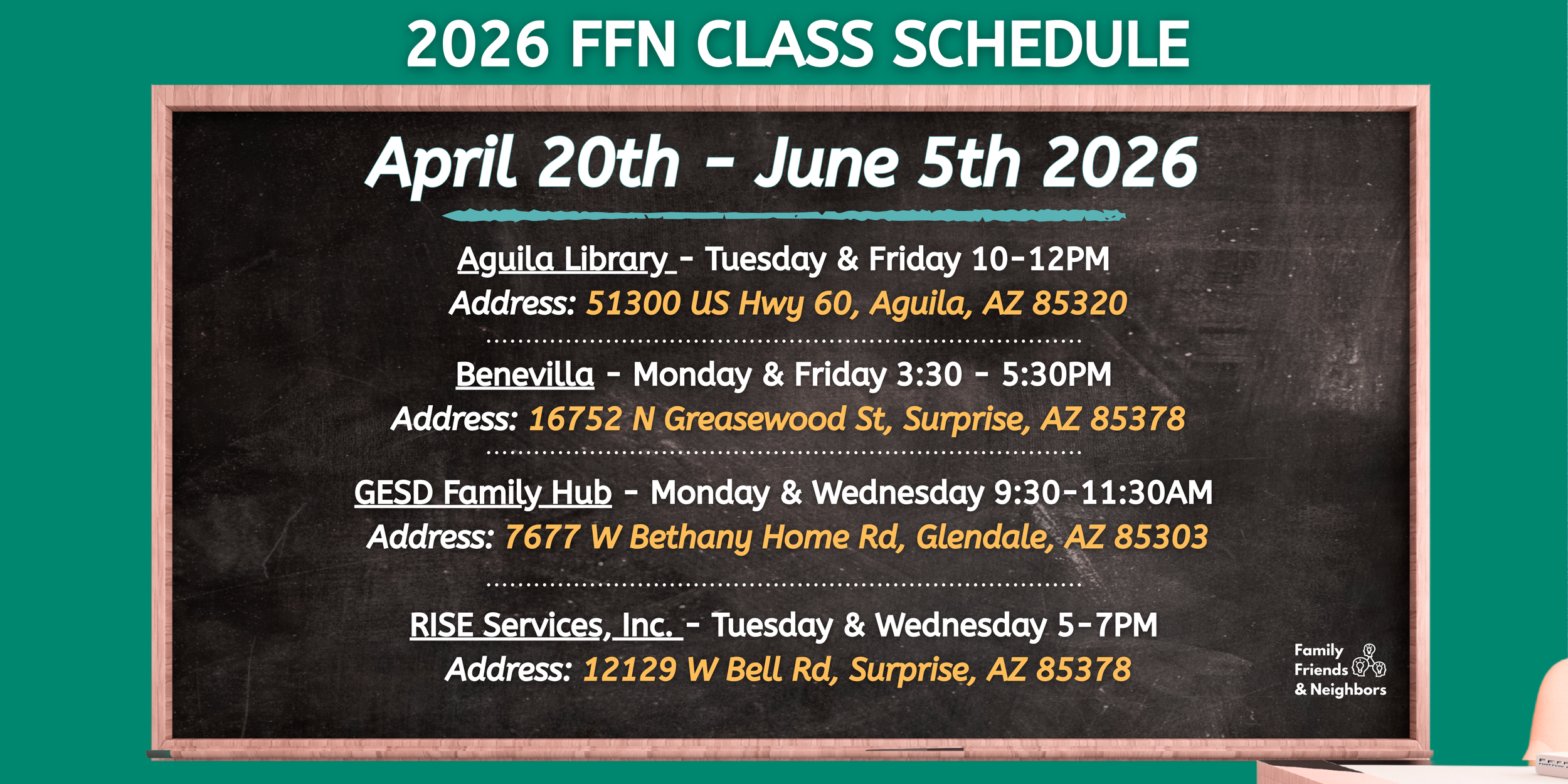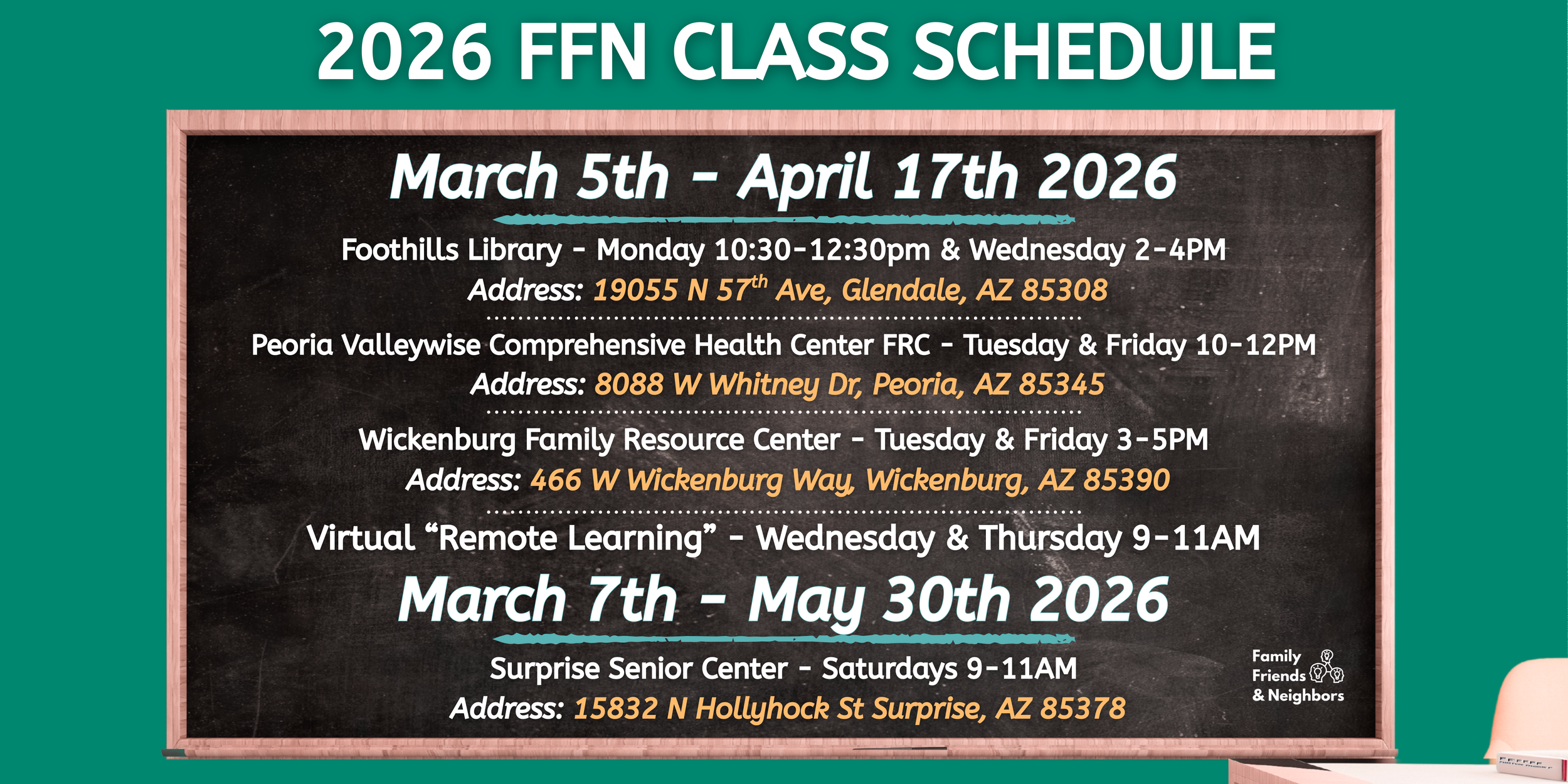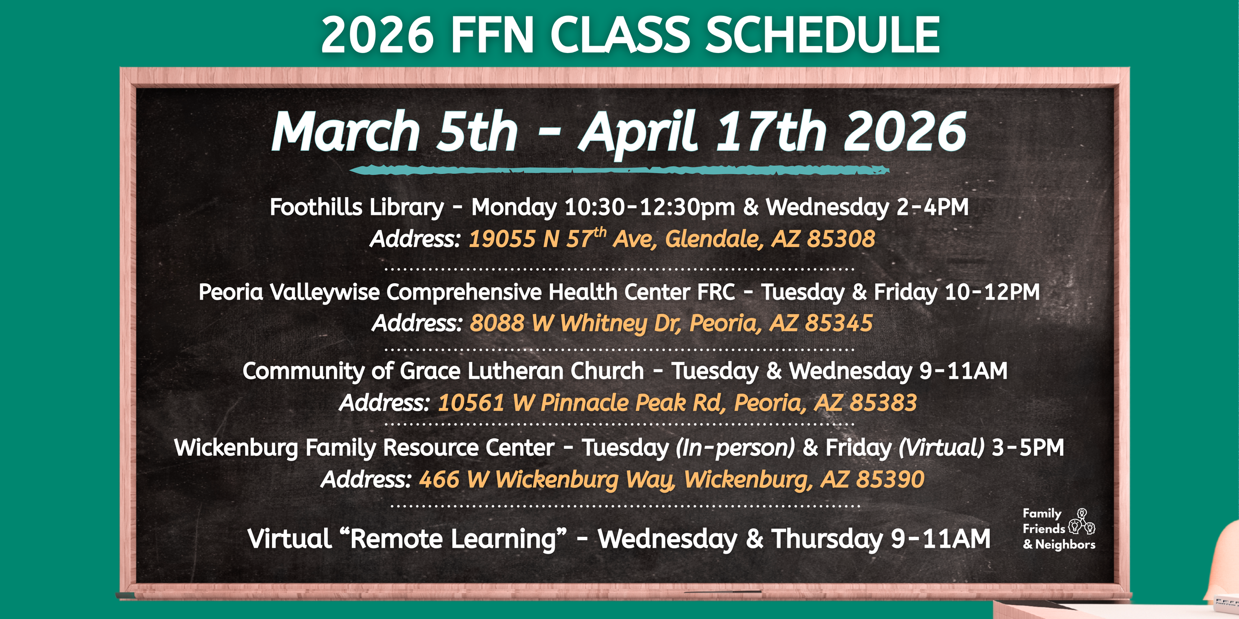 The Family, Friend & Neighbor (FFN) Caregiver Institute is a free program that helps caregivers learn tools and skills to support children’s healthy growth and development. Classes are held in community locations across Northwest Maricopa and run for 6–7 weeks, meeting two days a week for 2 hours each session. During this time, caregivers can connect with others, build confidence, and learn ways to prevent burnout while strengthening their caregiving skills.