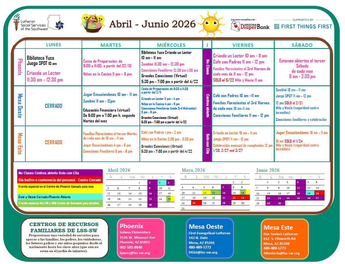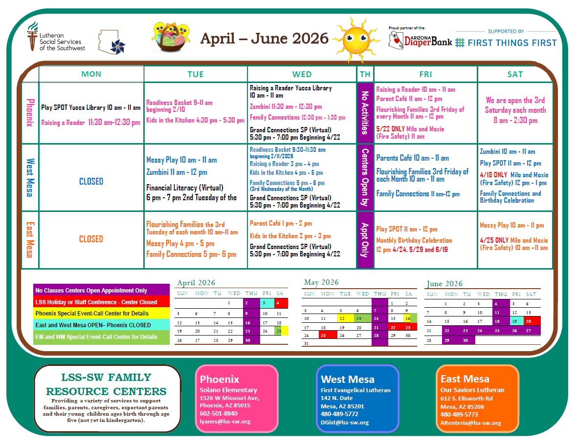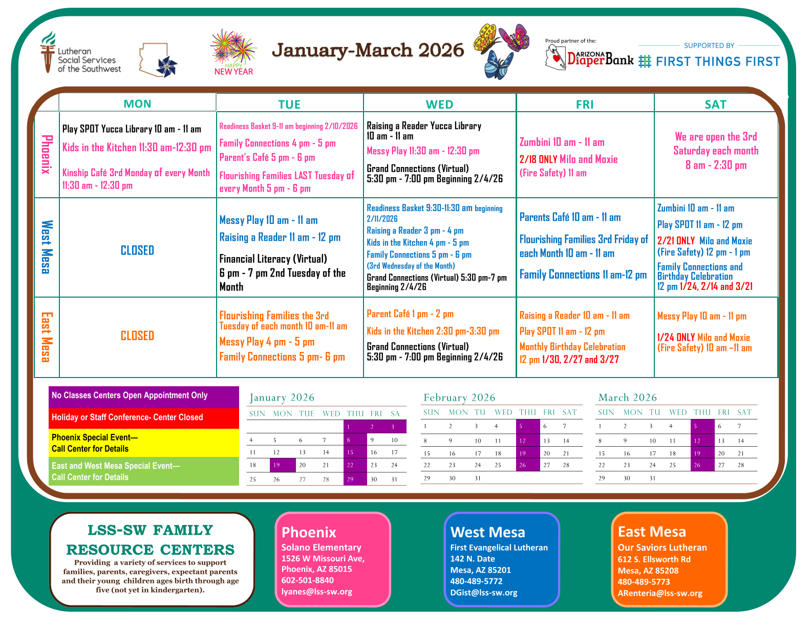 Lutheran Social Services of the Southwest Family Resource Centers, in partnership with First Things First, provide families with children birth to five years old access to information and links to the resources they need to be confident and capable in their ability to support their child’s safety, health and overall well-being.